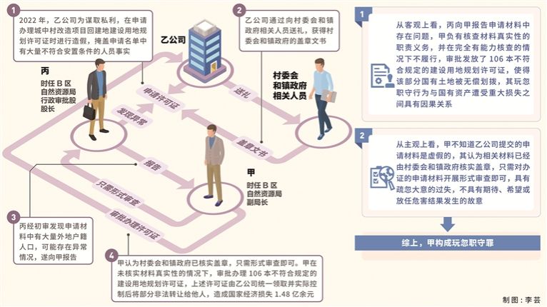 武清华:根据《中华人民共和国行政许可法》第三十四条规定,行政机关应当对申请人提交的申请材料进行审查。需要对申请材料的实质内容进行核实的,行政机关应当指派两名以上工作人员进行核查。本案中,B区自然资源局在审批发放建设用地规划许可证时具有审慎审查义务。该局行政审批股股长丙初审后发现申请材料中有大量外地户籍人口,可能存在问题,向甲报告后,甲未指派两名以上工作人员进行核查或者向上一级主管部门上报问题,而是直接审批同意,将该部分国有土地以无偿划拨方式发放给106户不符合条件的外地户籍人口(相关许可证由乙公司统一领取并部分非法转让获得巨额利益),造成国有资产重大损失,构成玩忽职守罪。